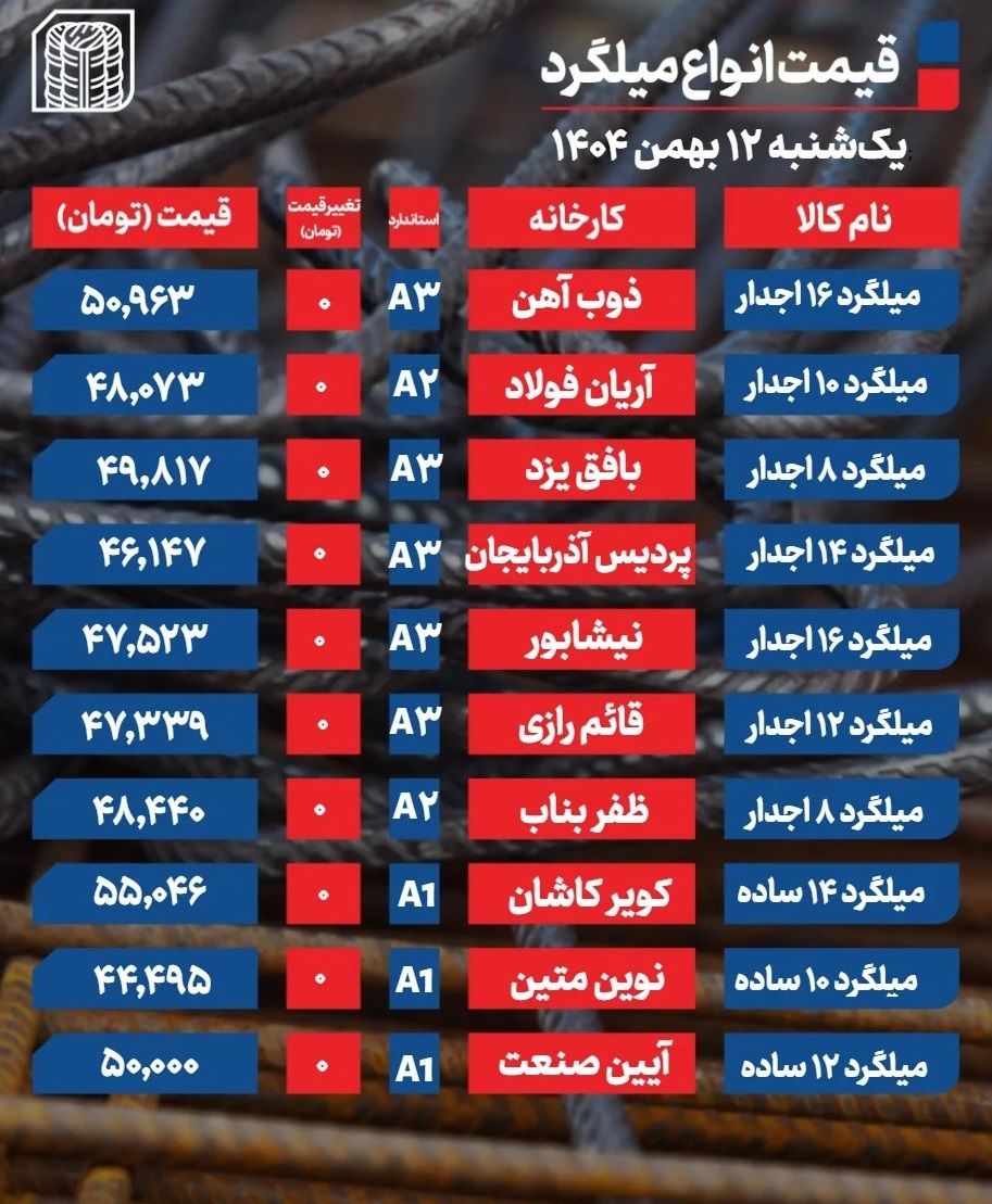قیمت میلگرد امروز ۱۲ بهمن ۱۴۰۴ + جدول